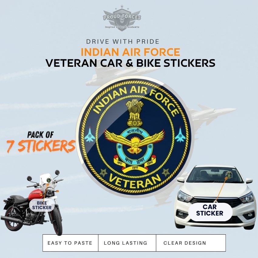 Proud Forces Premium Quality Air Force Veteran Car & Bike Stickers are designed to honour the bravery, discipline, and dedication of Indian Air Force veterans. These stickers give your vehicle a clean, dignified look while proudly reflecting your service and patriotism.