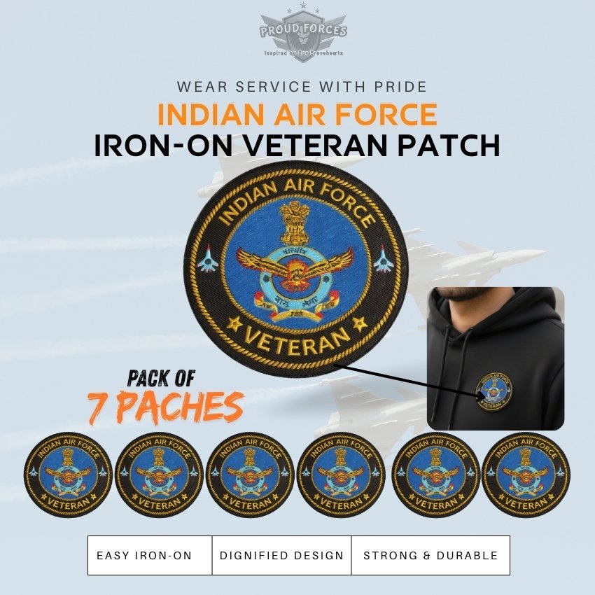 The Proud Forces Premium Quality Indian Air Force Veteran Iron-On Patches (Pack of 7) are thoughtfully designed to celebrate the bravery, discipline, and service of Indian Air Force veterans. These patches let you proudly showcase your identity and patriotic spirit through everyday apparel.