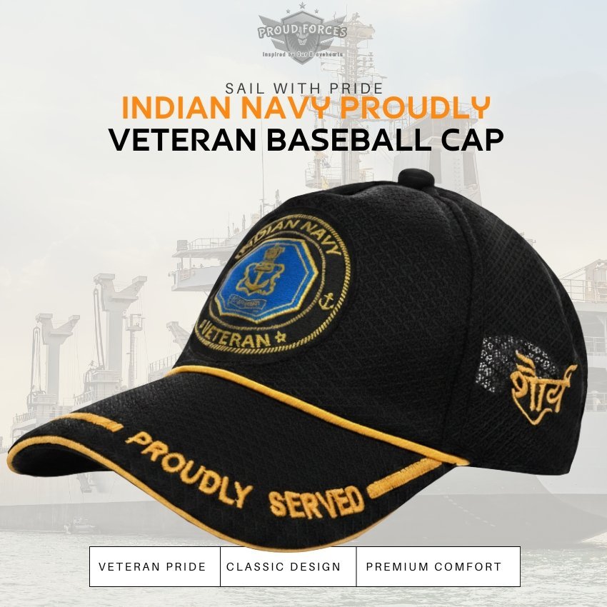 Proud Forces Premium Quality Indian Navy Proudly Baseball Cap (Black Color) is designed to honour the courage, dedication, and service of Indian Navy veterans. Featuring the “Proudly Served” design, this premium cap is perfect for daily wear, veteran gatherings, official events, or gifting, combining elegance, comfort, and respect.